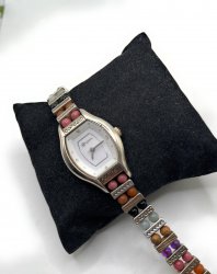 8 inches long, silver plated with Buckle clasp, black band, needs new battery. In good used condition. Price: $88.00 Sale Price: $25.00 You Save: $63.00 (72%)