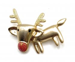 Matted goldtone with red nose pin. It is about 2 1/2 inches wide. Former display item in excellent condition. Price: $22.00 Sale Price: $10.00 You Save: $12.00 (55%)