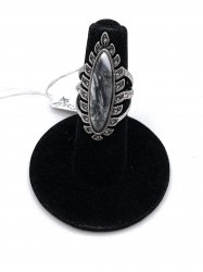 Semi-precious striped stone, antique rhodium-plated. Size 6. In new condition.