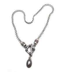17 inches long, silver plated with front toggle closure and pendant , in excellent used condition.