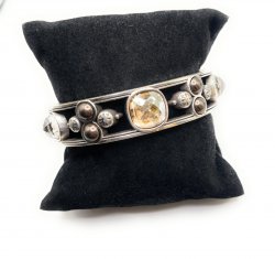 Silver plated, hinged Bangle/Cuff, magnetic closure, Amber tones. In good used condition.