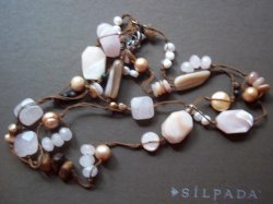 Silpada retired Necklace consists of pink freshwater pearls, rose quartz, shell and wood beads on a tan leather and sterling silver necklace. 35" long with a silpada emblem accent at the end, with a lobster clasp. Can be found on page 34 in the 2007-2008 catalog, new for $99.00. In good used condition.