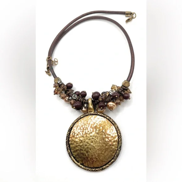 Retired Premier Designs necklace, called Caramel. It has a goldtone pendant which is 2 1/4" long, and is removable. Has a mix of accent beads. It is 17.5-19.5 inches long with a lobster clasp on a brown leather cord. It is in excellent used condition. Sold new for $68.