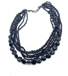 16 inches long, six-stranded necklace with a 3 inch extender, features 6 strands of hematite plated beads. In the 2013 catalog page 80. Former display item in excellent condition.