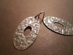 Sterling Silver earrings with etched designs on a flat oval design, approximately 2 1/4" long, can be found in the 2010 Catalog. In new condition.
