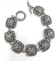 Antiqued silver plated, it is 7.5 inches ling with a toggle closure. Last in the 2006 catalog. Former display item in excellent condition.