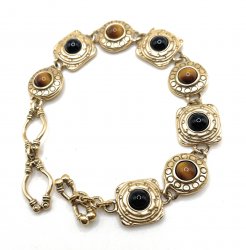 Antiqued & matte gold plated with genuine tigers eye, black onyx. It is 7 2/4 - 8 1/4 inches long with a toggle closure. Last in the 2006 catalog. Former display item in excellent condition.