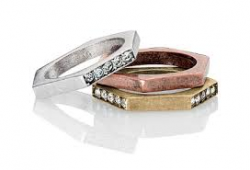 Matte silver, copper and gold rings with cut crystal accents stack up any way you like.. In new condition.