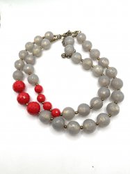 Double stranded with gray and red beads. It is 16-20 inches long with a 5 1/2 extender with a lobster claw closure. Sold new for $49. Last in the 2011 catalog page 93. Former display item in excellent condition.