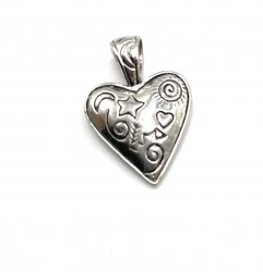 A different design on each side of this double-sided antiqued silver heart pendant. It is about 1 inch long. Silver plated, in new condition.