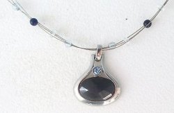Detailed necklace in silvertone with blue accents. It is 16-19 inches long. Last in the Spring/Summer 2009 Catalog. Former display item in excellent condition.