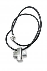 Detailed necklace in silvertone with a black leather cord. It is 20 inches long. Former display item in excellent condition.