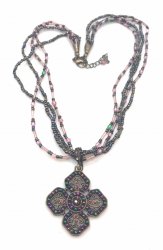 Antiqued matte gold plated with a mix of beads in pink and green tones. 17 1/2 inches long with a 2 extender with a lobster claw closure. Pendant removable. Last in the 2011 catalog page 15. Former display items.
