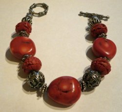 Fiery red coral, cinnabar and silver beaded bracelet with a toggle clasp. Fits up to a 7 1/4 inch wrist. In excellent condition, last in the 2004 catalog page 46.