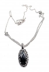 Silver plated with facted accent stone in ebony. 17-18 inches long. New for $59. Former display item in excellent condition.