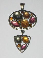 Matte gold with pastel accent stones. It is about 2 inches long. Former display item in excellent condition. Last in the Fall/Winter Catalog 2007.