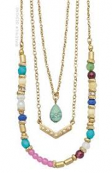 Matte gold tone, genuine aventurine, dyed jade/faux turquoise, crystals, glass and acrylics. It is 15 inches long three-strand necklace with 4 inch removable ext. w/lobster claw and 18 inch removable strand. Sold new for $44. Last in the 2016 catalog. Former display item in excellent condition.