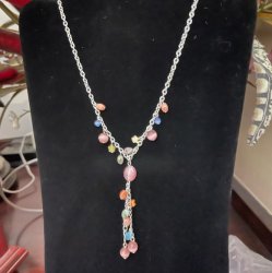 Silver plated with pastel beads. It is 16-18.5 inches long with a lobster claw closure. Last in the 2006 catalog page 71. Former display item in excellent condition.