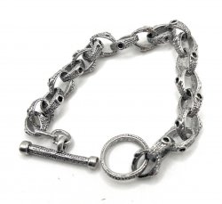 Antique silver plated with cut crystal accents, it is a toggle clasp. It is 7 3/4 inches long. Last in the 2002 catalog. In excellent condition.