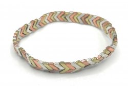 Antique matte silver plated, antique matte brass plated, antique matte copper plated, 7" stretch bracelet. In excellent like new condition.