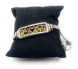 Silver and gold plated, with detailed heart filgree inset, toggle closure, 8 inches in total length, In excellent used condition. Price: $68.00 Sale Price: $35.00 You Save: $33.00 (49%)