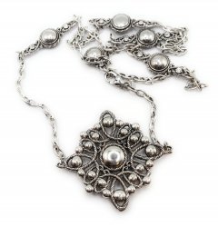 32-34 inches long, silver plated, pendant is 2 inches long, in good used condition. Price: $98.00 Sale Price: $35.00 You Save: $63.00 (64%)