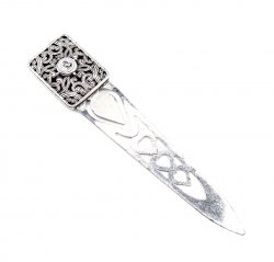 2.5 inches long, silver plated with inlay Angels. In new condition.