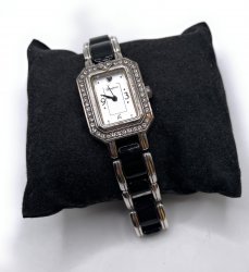 7 inches long, foldover clasp, silver plated with black inserts, cut crystals, watch face is 1 inch long. NEEDS new battery. In excellent condition. Price: $98.00 Sale Price: $29.00 You Save: $69.00 (70%)