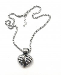 26 inches long, silver plated heart pendant which is , it is 2 inches long. In excellent like new condition. Price: $68.00 Sale Price: $35.00 You Save: $33.00 (49%)