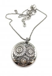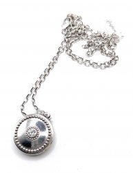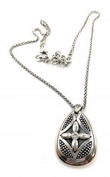30 inches long, silver plated, locket is 1.5 inches long, in new with tags on condition. Price: $75.00 Sale Price: $35.00 You Save: $40.00 (53%)