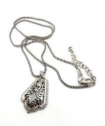 18 inches long, silver plated necklace, pendant is 1.75 inches long. In excellent like new condition. Price: $36.00 Sale Price: $10.00 You Save: $26.00 (72%)