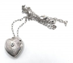 30 inches long, silver plated, locket is 1.5 inches long, in good used condition. Price: $75.00 Sale Price: $35.00 You Save: $40.00 (53%)