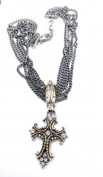 18 inches long, Silver and gold Cross pendant. Pendant is 3 inches long. In excellent condition. Price: $68.00 Sale Price: $35.00 You Save: $33.00 (49%)