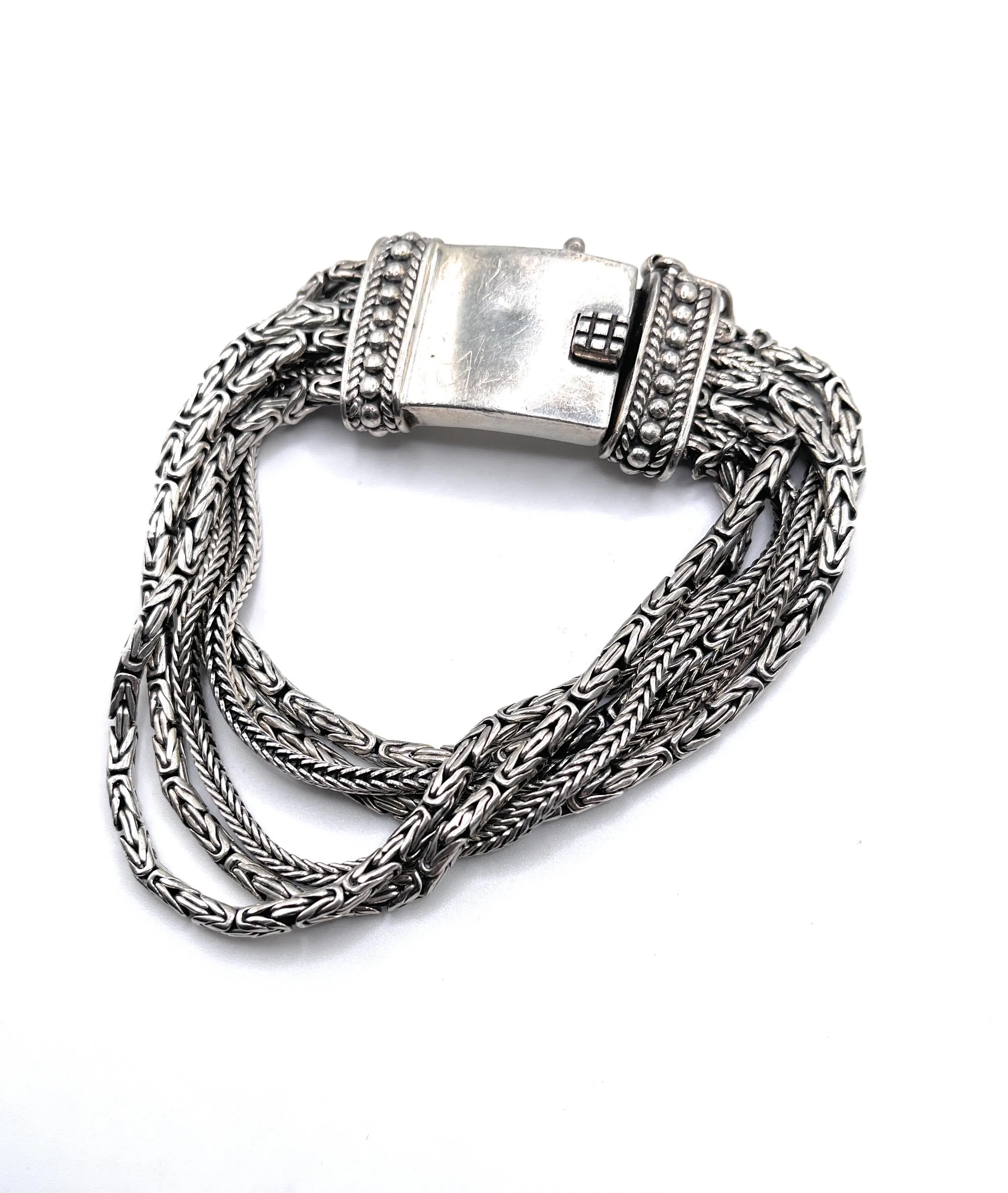 Silpada Bracelet consists of sterling silver strains of make up a great looking bracelet, has a box clasp. It is 7.5" in length. Can be found in the 2013 catalog. In excellent used condition, has small dent. Price: $269.00 Sale Price: $189.00 You Save: $80.00 (30%)