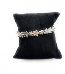Silver plated bracelet with flower accents, crystal accents, in excellent used condition, hinged design. Price: $58.00 Sale Price: $33.00 You Save: $25.00 (43%)